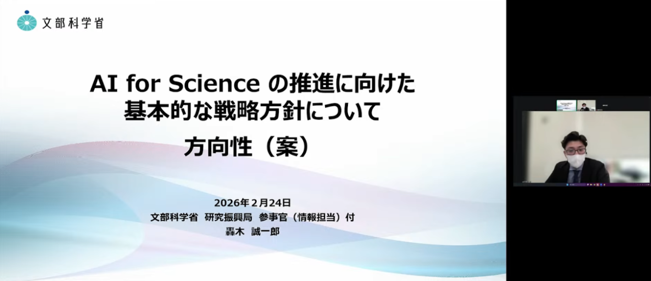 文部科学省 研究振興局 参事官(情報担当)付 轟木 誠一郎様によるオンライン上でのご講演の様子